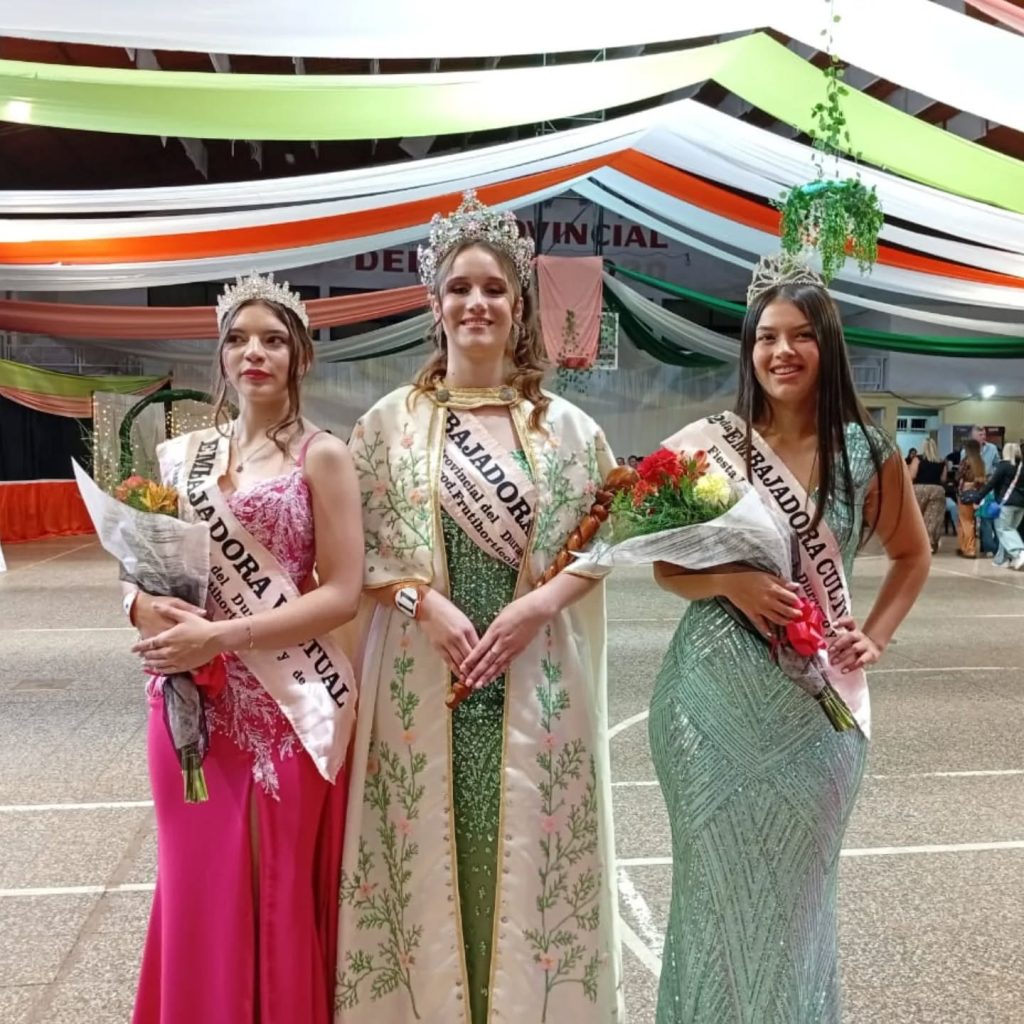 Junto a ella, otras jóvenes fueron distinguidas por su carisma y compromiso. Macarena Petroski, representante de Candelaria, recibió el título de Miss Amistad y Segunda Embajadora, mientras que Marianela Trumpp, oriunda de Montecarlo, fue elegida como Embajadora Virtual, destacándose por su labor en redes sociales y promoción digital de la producción frutihortícola.