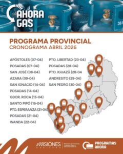 Durante marzo, el Ahora Gas recorrerá las localidades de Apóstoles (7/4); Posadas (7/4); San José (8/4); Azara (9/4); San Ignacio (14/4); Posadas (14/4); Gobernador Roca (15/4); Santo Pipó (16/4); Puerto Esperanza (21/4); Posadas (21/4); Wanda (22/4); Puerto Libertad (23/4); Posadas (28/4); Puerto Iguazú (28/4); Andresito (29/4) y San Pedro (30/4).