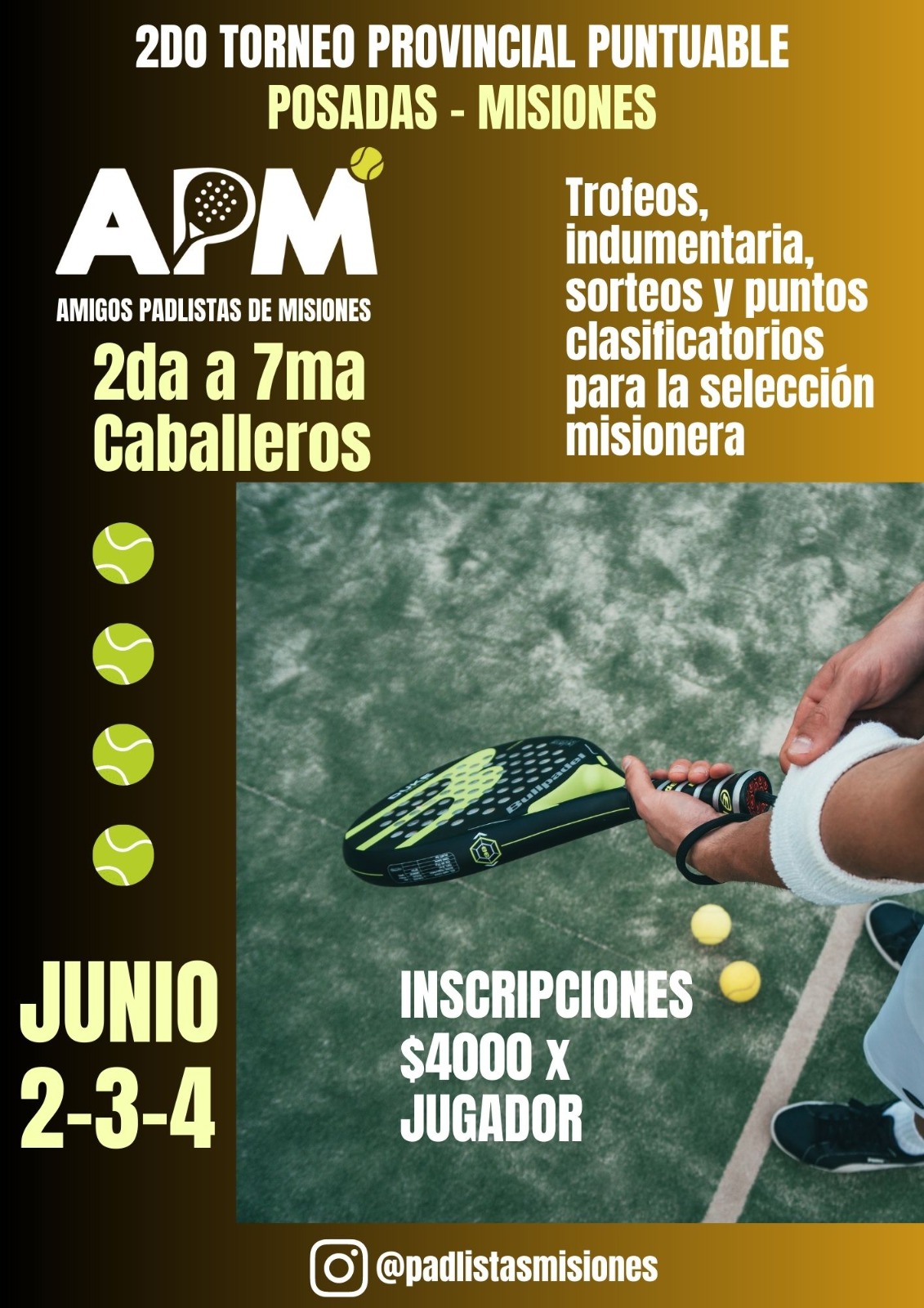 Tras el éxito del primer torneo puntuable de la Asociación Civil Amigos Padlistas de Misiones (APM), la segunda fecha está cada vez más cerca: del 2 al 4 de junio en Posadas, oportunidad en la que se disputarán todas las categorías de Segunda a Séptima caballeros, entregando puntos para el ranking provincial en cada categoría, trofeos e indumentaria de premios, y muchas sorpresas más como ya se vivió en la anterior edición.