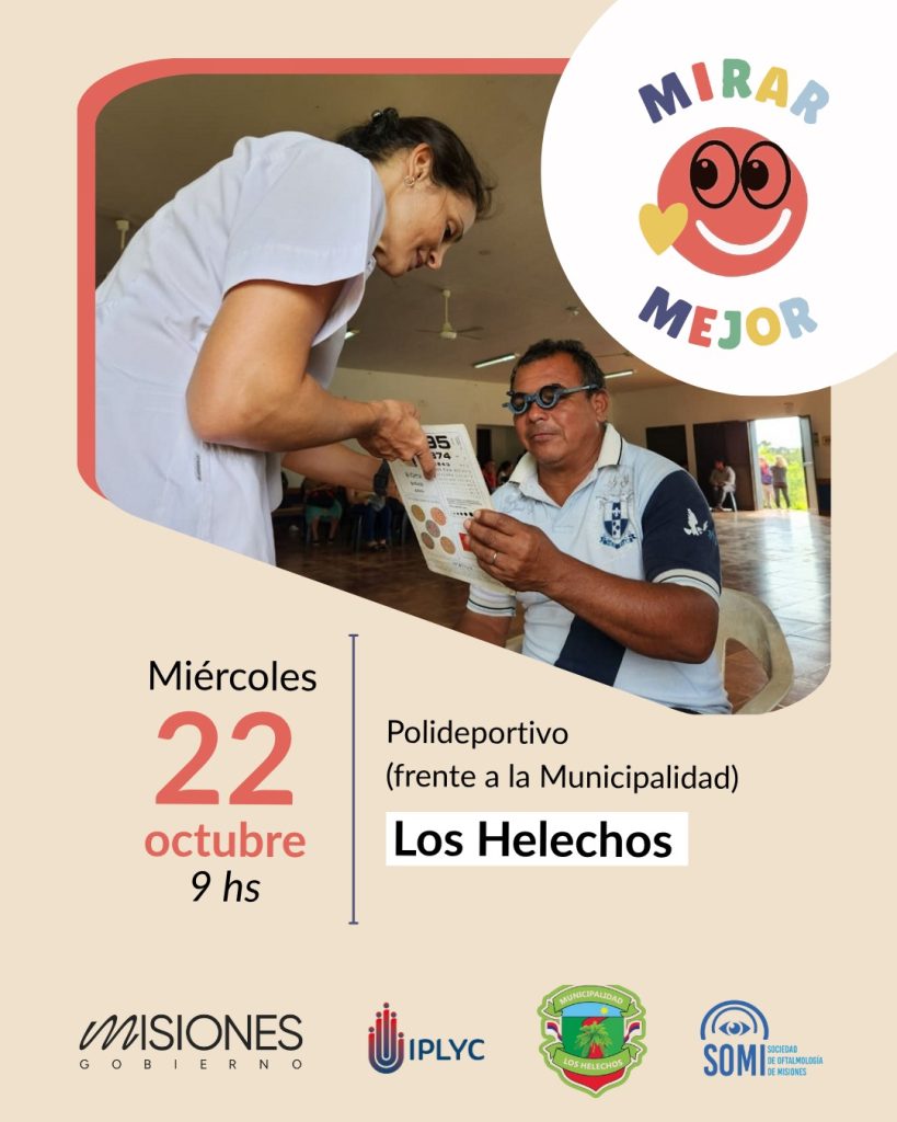 El programa provincial de atención oftalmológica Mirar Mejor se realizará este miércoles -22 de octubre-, desde las 9, en el Polideportivo ubicado frente a la Municipalidad de Los Helechos.