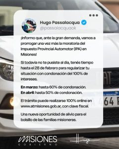 El gobernador Hugo Passalacqua informó por sus redes sociales la prórroga del plazo general de adhesión a la moratoria del IPA, que ahora se extenderá hasta el 30 de abril de 2026. La decisión mantiene las condiciones y beneficios originalmente previstos en el régimen. La medida alcanza a contribuyentes con deudas acumuladas hasta el año 2025.