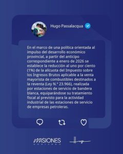 En el marco de una política orientada al impulso del desarrollo económico provincial, el gobernador de Misiones, Hugo Passalacqua, anunció una reducción en la alícuota del Impuesto sobre los Ingresos Brutos aplicable a la venta mayorista de combustibles destinados a la reventa, realizada por estaciones de servicio de bandera blanca.