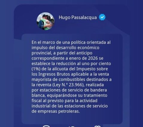 “En el marco de una política orientada al impulso del desarrollo económico provincial, a partir del anticipo correspondiente a enero de 2026 se establece la reducción al uno por ciento (1%) de la alícuota del Impuesto sobre los Ingresos Brutos aplicable a la venta mayorista de combustibles destinados a la reventa (Ley N.º 23.966), realizada por estaciones de servicio de bandera blanca, equiparándose su tratamiento fiscal al previsto para la actividad industrial de las estaciones de servicio de empresas petroleras”.