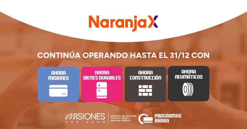 El ministro de Hacienda, Adolfo Safrán, anunció a través de sus redes sociales que, tras la renovación de los Programas Ahora comunicada por el gobernador Hugo Passalacqua, a partir del 1° de octubre, Tarjeta Naranja X, medio de pago que se había sumado a los programas en agosto pasado, confirmó su continuidad en Ahora Misiones, Ahora Construcción y Ahora Bienes Durables; y también amplió su participación sumándose al programa Ahora Neumáticos.