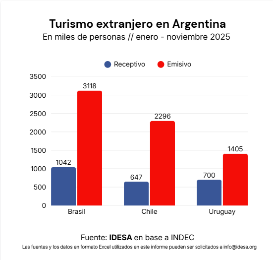 Otro punto a reflexionar es que para que aumenten las exportaciones la producción nacional debe ser competitiva. El ejemplo del turismo es muy ilustrativo. Tomando los datos del INDEC sobre turismo internacional, entre enero y noviembre del 2025, se observa que: